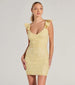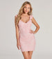 This sequin mini dress exudes sparkle making it perfect for school dances or birthdays. The bodycon dress features a V-neckline with padded bra cups. ruffle trim adjustable spaghetti straps. and a cutout back.Â