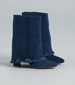 These trend-forward denim boots are the new style you're looking for! They feature a pointed toe. a thin block heel. a foldover design with frayed trim. and a calf-length shaft. Complete the look with a mini handbag for day or night plans!