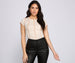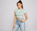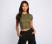 This top is anything but basic! The top features a crew neckline. short sleeves. contrasting exposed seams. and a subtly cropped hem. The top is composed of a ribbed knit fabric that offers a relaxed fit with a moderate stretch. Complete the look with denim shorts and wedges.Â