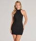 The Nylah crepe bodycon mini dress brings classy style with glam allure! The dress features a sleeveless mock neck and an open back with dazzling rhinestone fringe. Style with a hair accessory and heels.