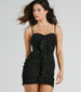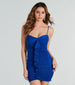 This ruffled bodycon mini dress will have you looking oh-so-fab as you make your entrance! Designed with a stretchy lined knit fabric. this mini-length dress features a sleeveless sweetheart neckline. spaghetti straps. ruching down the center with a trendy ruffled trim. and a bodycon silhouette to flaunt your stunning figure. Complete your party look with platform heels.