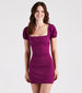 Create an oh-so-sweet look in this darling puff sleeve mini dress! It features a square neckline. short puff sleeves. an open-back design with bar straps. a mini-length hem. and a form-hugging fit for a figure-flattering silhouette. The crepe fabric offers a moderate stretch. Style with clear heels for a dinner date.