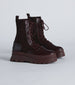 Take on the season in these combat booties with confidence and style! Featuring stylish faux leather details. a front lace-up placket. stretchy knit material. and a sturdy lug rubber sole. these booties combine fashion and function for any adventure. Complete the look in a trendy denim jacket for casual plans!
