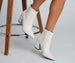Keep your look on point with booties that elevate your casual outfits. The booties feature an around the ankle fit. elastic goring at the ankle. pointy toe. and a block heel. The booties are composed of a faux leather material. Complete look with a ribbed sweater and skinny jeans.