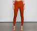 Keep your look on point with high waist leggings that slay! The leggings feature a high-rise waist. a ruched back. and a skinny leg fit with a tapered hem. The pants are composed of a Ponte-like knit fabric that offers a form hugging fit with a moderate stretch. Complete look with a crop top and clear heels.Â