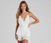 You'll be left on their mind with this cute romper! The romper features a sleeveless V-neckline. adjustable spaghetti straps that cross at the back. tie-back straps. an empire waist. a tiered skater overlay. and wide-leg shorts. Complete look with wedges and dainty charm necklaces.Â