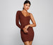 This glitter mini dress is all you need to steal the show! It features a one-shoulder long sleeve design with a single spaghetti strap. a sweetheart neckline with padded cups. and a form-hugging silhouette. The textured-knit fabric offers a moderate stretch. Style with hoop earrings.