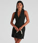 Bring only chic vibes in this on-trend fitted vest dress. It features a sleeveless bodice. a V-neckline with a lapel collar. a button-down front. and a mini-length silhouette. Style this crepe-woven dress with an embossed handbag and strappy heels.