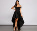You'll be red carpet ready in our Ora gown! She features a fitted bodice with an off the shoulder neckline and a flared high-low skirt. She includes a padded bust and a petticoat for added volume. Complete your formal outfit with rhinestone heels for a truly stunning impression.