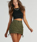 You're a stylish girl on the go. so you need a trendy mini skort to create cute everyday 'fits! Made from a smooth woven fabric. this skort is designed with a mid-rise waist and a mini-length overlay over fitted shorts for added coverage. The waist is accented with belt loops. a hidden zipper. and button-front closures. The adjustable drawstrings at the hem offer all-over ruching to accentuate your curves. Pair this mini skort with a bodysuit and combat boots.