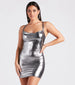 Feel like a total space babe in this metallic mini dress at the club! Featuring a sleeveless cowl neckline. spaghetti straps. a bodycon silhouette. and a mini-length fitted hem. The smooth metallic knit fabric has a moderate stretch. Complete the look with statement platform heels.