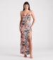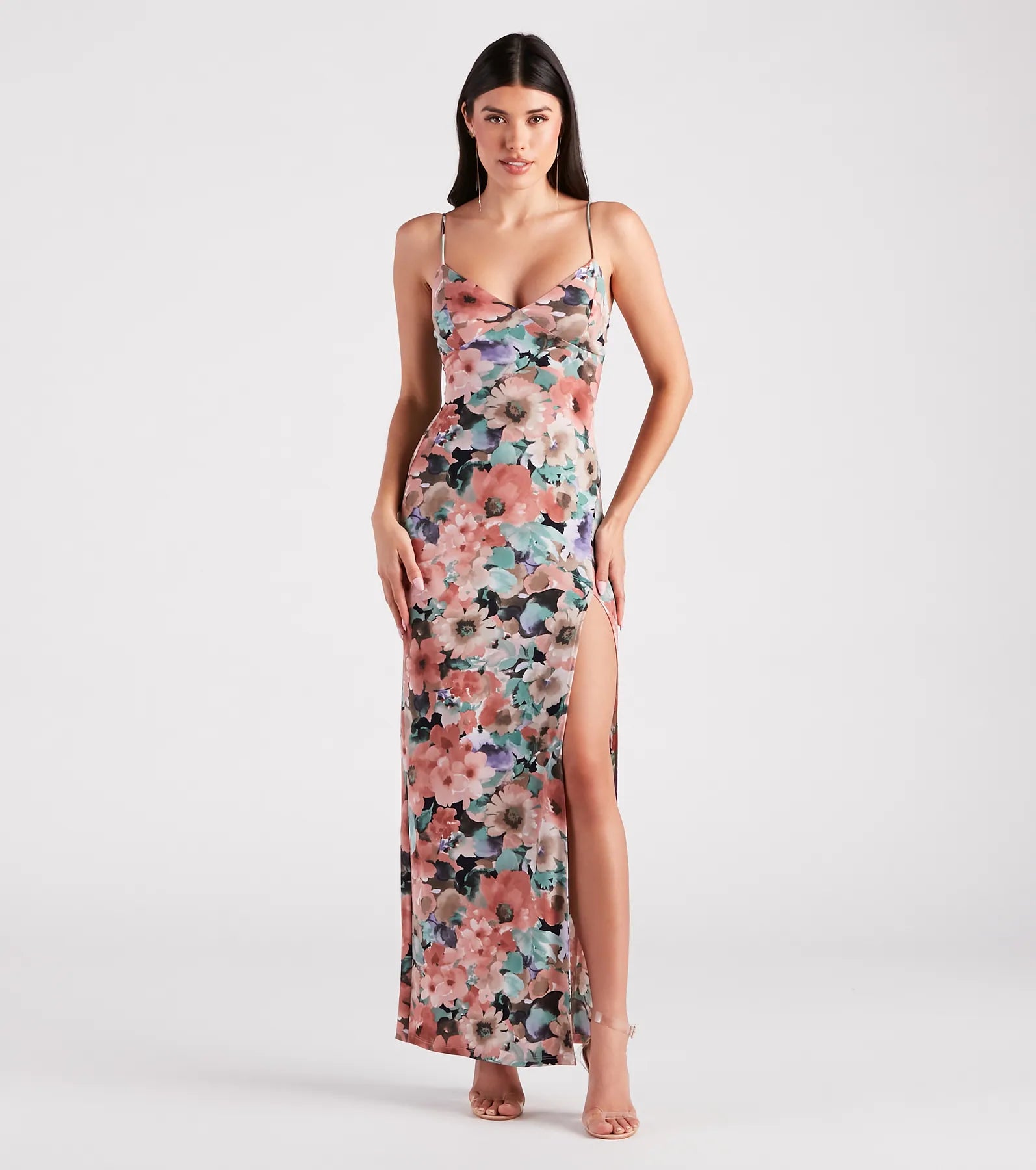 This floral maxi dress will fit like a dream and give off major artsy vibes! It features a sleeveless V-neckline. spaghetti straps. a hip-hugging fit. and a sultry front slit along the flowy hem. Complete the look in dainty earrings for a daytime soiree!