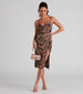 Look perfect in paradise wearing this palm print midi dress featuring a sleeveless. v-neck. spaghetti straps. a form-fitting silhouette. and a front slit accent on stretchy knit fabric. Complete your vacation look in wedges.