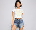Showcase those good vibes in this trendy graphic tee that is perf for summer! It features a crew neckline. short sleeves. a center script that reads "Peace And Love." and a cropped. form-hugging fit. Style this tee with denim shorts and sneakers.