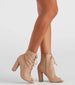 Peek-a-boo do you see these chic shoes? Strut the catwalk in these faux suede booties featuring a peep toe almond toe. block heel. and a front lace-up placket and side zipper closure. Complete the look in a wide-leg jumpsuit.