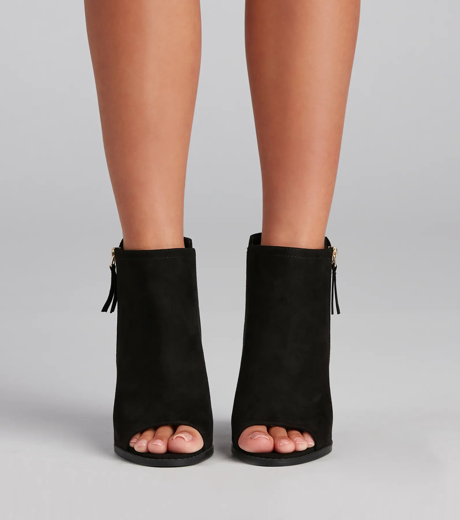 Watch everyone glance your way in these cute suede booties featuring an open almond toe. zipper closure. stacked block heel. on microsuede material. Perfect for styling with a bodycon dress.