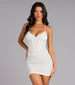 Built for the spotlight. the Penelope mini dress captivates with every curve and crystal. Designed with a corset-structured bodice. halter neckline. and open lace-up back. this rhinestone mini dress brings a sculpted. luminous finish to your night-out lineup.