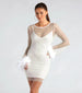 The Penelope rhinestone fishnet feather trim party dress has a sultry. flirtatious allure that will get you all the compliments on your next dressy night out. She features a sheer fishnet layer with all-over sparkling rhinestone embellishments. a crew neckline. long bell sleeves with a marabou feather trim. and a mini-length hem. The sleeveless knit lining features a V-neckline. spaghetti straps. and a mini-length hem. The dress has a bodycon silhouette to flaunt your figure. Style this mini dress and complete your glitzy going-out look with strappy stiletto heels.