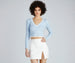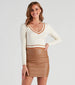 Keep it preppy with this varsity-inspired sweater! The cable knit sweater features V-neckline. long sleeves. contrasting striped trim. and a cropped hem. Complete look with a pleated mini skirt.