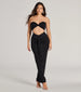 Have all eyes on you in this strapless maxi dress boasting a sweetheart twist neckline and a cutout bodice. The smooth knit fabric hugs your curves along the form-hugging silhouette and creates a front center ruffle design.Â