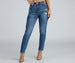 Hey babe. we've found the perfect pair of lightly distressed denim for you! These jeans feature a high-rise waist. light distressing. and a skinny straight fit. The medium wash denim fabric offers a moderate stretch. Style these jeans with a cropped blouse and heeled booties.