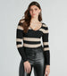 This sweater top is the perfect reason to get comfy and stay cute during chilly mornings! It features fitted long sleeves. a V-neckline. and a fitted silhouette on stretchy rib knit fabric showcasing a trendy striped pattern. Complete the look in high-rise pants and booties for casual plans!