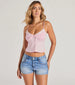 The perfect twist on a closet staple! This delicate crop top features dainty spaghetti straps a romantic lace trim bow V-neckline and a fitted crop hem. Complete the look in sassy denim shorts.