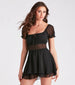 Look like perfection in this chiffon skater romper for a night of fun vibes! It features adorable sheer puff short sleeves. a scoop neckline with a flirty bust tie front and keyhole. a sheer elasticized waist. and a flowy short-length hem. Complete the look in strappy heels for a celebration!