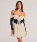 You'll look perfectly chic in this adorable skater dress designed with sheer chiffon and mesh fabrics. It features an off-the-shoulder sweetheart neckline with the cutest bow detail. a padded bust for support. draped short sleeves over sheer mesh long fitted sleeves. and a short skater silhouette.