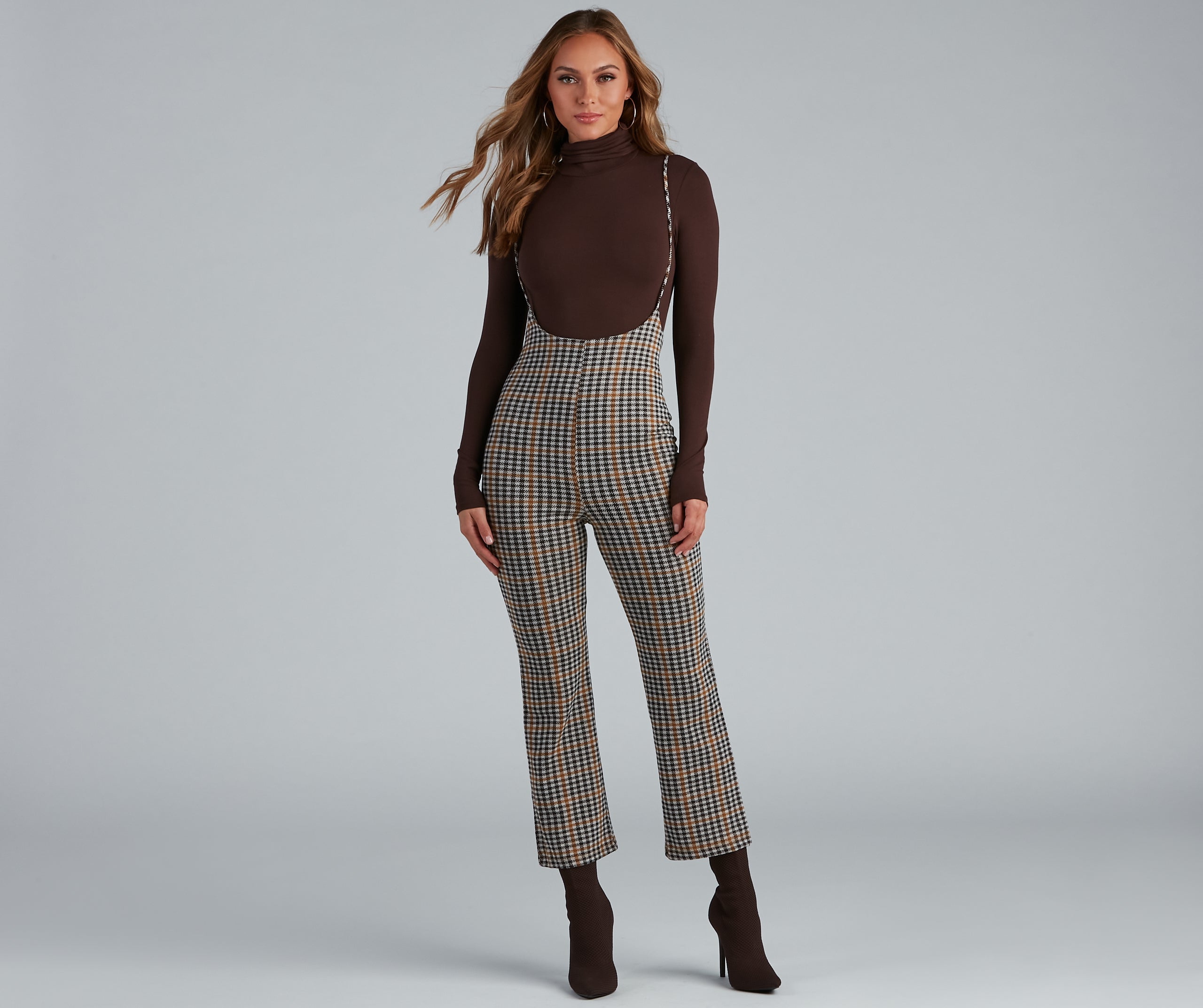 Keep it poised in plaid! These suspender pants feature a high-rise fit. spaghetti straps. and skinny leg pants. The all-over plaid print easily mixes and matches with your favorite tops! The suspended pants are composed of a lined woven fabric that offers a form hugging fit with slight stretch stretch. Complete look with a ribbed bodysuit and lug boots.