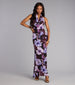 This halter maxi dress stuns with a draped cowl neckline. bold floral print. and a daring open back that leaves a lasting impression. Flowing and form-flattering. it's your go-to for romantic date nights and elevated occasions.