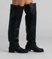 You've got places to be seen in these faux leather thigh-high boots! They feature a square toe. a chunky sole and short block heel. a hoop metal strap accent. and an over-the-knee shaft height with pull tabs for easy on-and-off styling. Complete the look in a sleek crop jacket for a dinner and movie downtown!