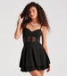 Made for more than just twirling. this crepe mini skater dress is ready to play up your cuteness at the party! Featuring a sleeveless V-neckline. padded bust. adjustable spaghetti straps. a sheer mesh bodice with trim. and a flattering skater silhouette with a layered short-length hem. Complete the look with a charming hair accessory.