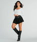 The perfect woven mini skirt to add a playful touch to your style! This high-rise skirt features faux leather double belt accents. creating a chic and sophisticated look. a pleated A-line skater silhouette. and a flirty mini-length hem on woven fabric. Complete the look in a basic top and chic knee-high boots for visiting downtown!