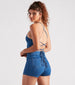 Play up your style in this fun and flirty denim romper perfect for visiting a beach town or a casual hang with friends! It features a sleeveless square neck. spaghetti straps that create the lace-up open-back design. back pockets. and a fitted short-length hem. Complete the look in cute flat sandals.