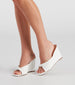 These square toe wedges are such a treat! They feature a twisted pleat strap. wedge sole. and PU material. Complete the look in a flirty sundress for a daytime event.