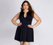 Be a stunner in this pretty and pleated skater dress! It features a sleeveless bodice. wide shoulder straps. a deep V neckline. padded cups. an empire waistband. and a skater skirt paired with pleated details. The dress is composed of a crepe fabric that offers moderate stretch and includes a lined bodice.