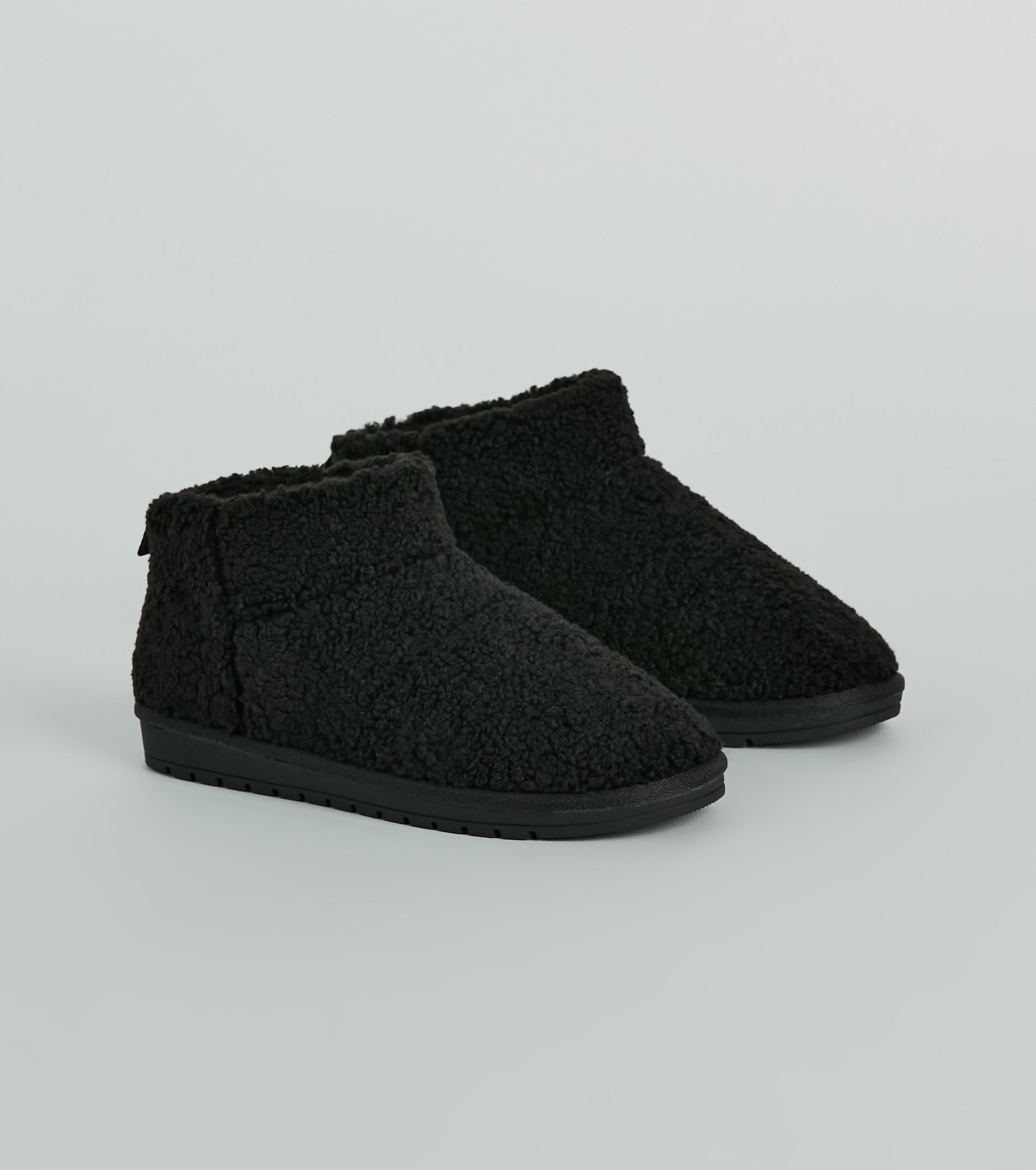 Step into the plush comfort of these faux sherpa booties you'll be obsessed with the coziness! Perfect for lounging at home. stepping outside. or coffee runs these booties are designed with a sturdy rubber traction sole. soft faux sherpa material. and a luxe faux fur footbed to keep extra warm. Complete the look with a cozy crop jacket.