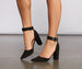 Keep it poised in heels that reflect your chic fashion taste. The heels feature a pointed toe. a wide adjustable ankle strap with buckle. and a block heel. Complete look with a matching set.