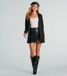 You'll polish up your outfit real nice with this faux suede blazer featuring three-quarter-length sleeves with rolled cuffs. a lapel collar neckline. an open-front design. side pockets. and a slim longline hem. Layer this blazer over a chic corset and jeans.