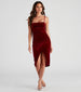 Keep your party look elevated and posh in this pleated velvet midi dress. It features a sleeveless square neckline. spaghetti straps. pleating at the waist. a wrap-front skirt creating a chic front slit to showcase some leg. and a curve-hugging silhouette. The smooth velvet fabric offers a moderate stretch. Style with stiletto heels.