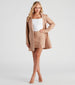 You'll be prepped for a successful outfit this fall by layering on this faux suede long blazer featuring long sleeves. a lapel collar neckline. an open-front design. and a contemporary houndstooth plaid pattern. The smooth faux suede fabric offers a moderate stretch. Complete your fit with the matching skirt!