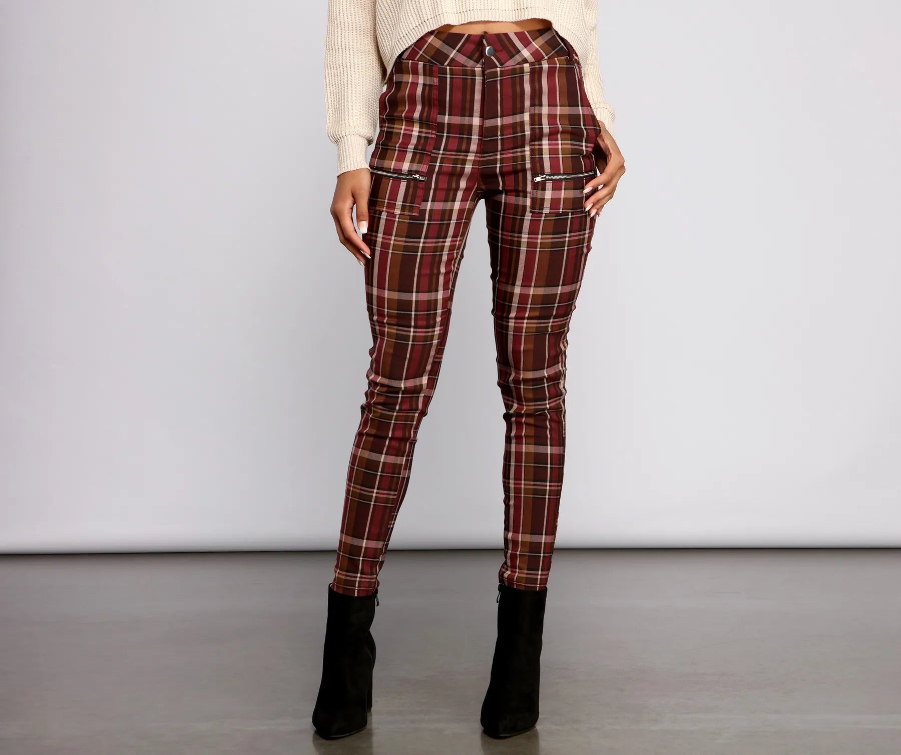 Keep it preppy in plaid pants that are perf for creating chic back to school outfits. The pants feature a mid-rise fit. slant pockets. a single button with zipper closure. two small zippered pockets. and a plaid print. The pants are composed of a stretchy woven fabric that offers a form hugging fit. Complete look with a faux leather jacket.