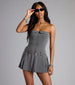 The perfect dress for fall—this strapless pinstripe mini dress blends polished structure with playful pleats. Toss on a blazer or knee-high boots for seasonal chic.