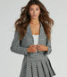 Style up a look of preppy perfection with this gingham twill cropped blazer! This structured blazer is designed with a fine twill fabric and a chic gingham pattern to step up your everyday 'fits. It features a classic lapel collar. open front design. long sleeves with button accents and shoulder pads. and a cropped hem with an all-over fitted silhouette. Pair with the matching mini skort for a seamlessly fab look!