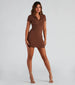 Keep up your trendsetter status in this preppy-casual knit mini dress! It features a collared V-neckline. short fitted sleeves. and a short. form-hugging fit. Style with ankle booties and a cute shacket.
