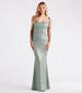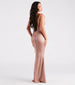 Bring the sultry chic shine to your next formal occasion in the Presley foiled metallic mermaid dress! She features a sleeveless cowl neckline with ruched detailing. tie-shoulder spaghetti straps that cascade down. a bold open back. a hip-hugging fit. and a floor-length hem with a mermaid silhouette. The knit fabric features an alluring all-over foiled metallic shine for an eye-catching vibe. Style with rhinestone statement earrings.