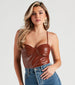 You'll wanna press pause cause you'll be obsessed with how you slay in this faux leather corset bodysuit perfect for a night out. It features a sleeveless sweetheart neckline. adjustable and detachable spaghetti straps. ruched bust. fitted bodice. and mesh thong bottom with dual snap-button closures. Complete the look in straight-leg jeans.