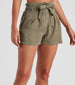 Press pause and admire how stylish you'll be in these woven shorts featuring a trendy. paper bag high-rise waist. tie-front belt. pleat detailing. a four-button up closure. side pockets. and a form-fitting silhouette. Complete the look in a basic tank top and espadrille wedges.