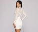 Wow in the Pretty In Lace long sleeve mini dress! It features a lace crafted top with smooth knit lining. scalloped trim V-neck. and long sleeves. The bottom half of this darling piece is composed of a crepe fabric that offers a curve-hugging fit with moderate stretch. Zipper is included at the back.